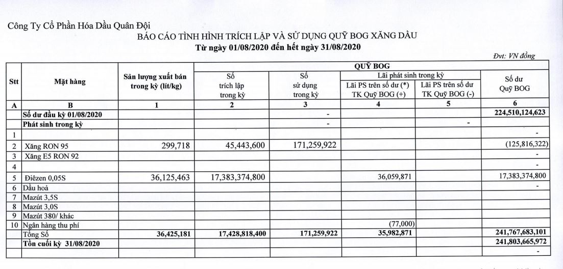 Báo cáo tình hình trích lập và sử dụng quỹ bình ổn giá xăng dầu của Công ty Cổ phần Hóa dầu Quân đội: