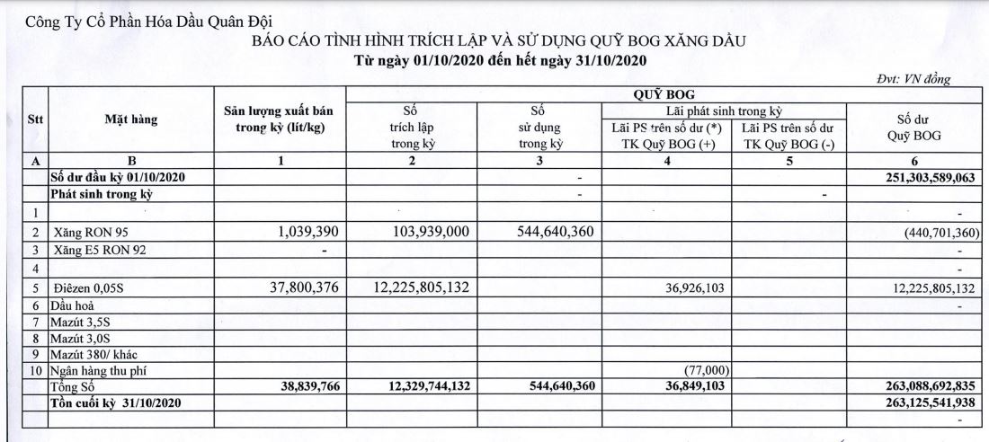 Báo cáo tình hình trích lập và sử dụng quỹ bình ổn giá xăng dầu của Công ty Cổ phần Hóa dầu Quân đội:
