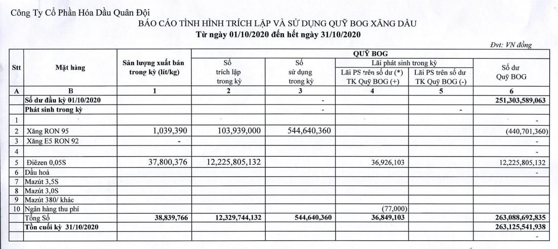 Báo cáo tình hình trích lập và sử dụng quỹ bình ổn giá xăng dầu của Công ty Cổ phần Hóa dầu Quân đội: