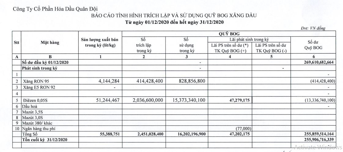 Báo cáo tình hình trích lập và sử dụng quỹ bình ổn giá xăng dầu của Công ty Cổ phần Hóa dầu Quân đội: