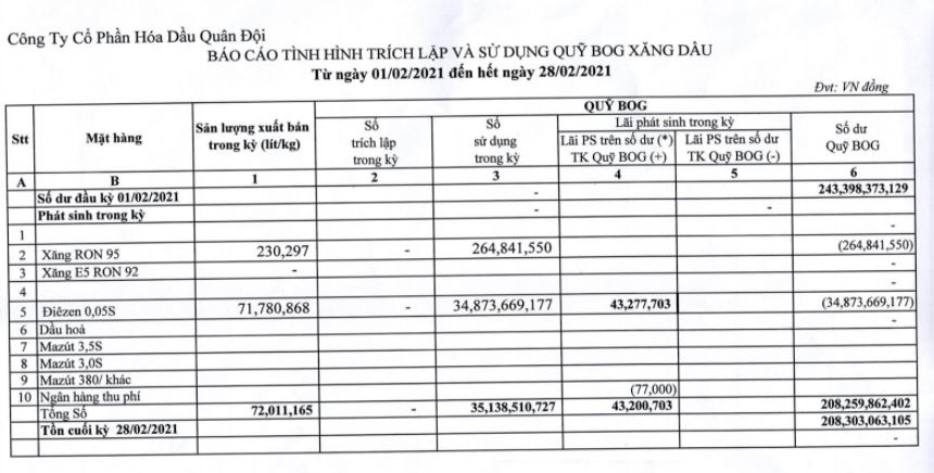 Báo cáo tình hình trích lập và sử dụng quỹ bình ổn giá xăng dầu của Công ty Cổ phần Hóa dầu Quân đội: