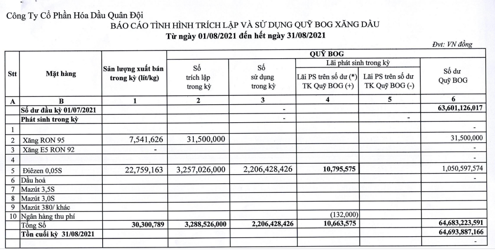 Báo cáo tình hình trích lập và sử dụng quỹ bình ổn giá xăng dầu của Công ty Cổ phần Hóa dầu Quân đội: