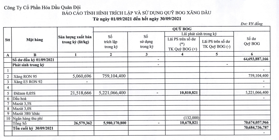 Báo cáo tình hình trích lập và sử dụng quỹ bình ổn giá xăng dầu của Công ty Cổ phần Hóa dầu Quân đội: