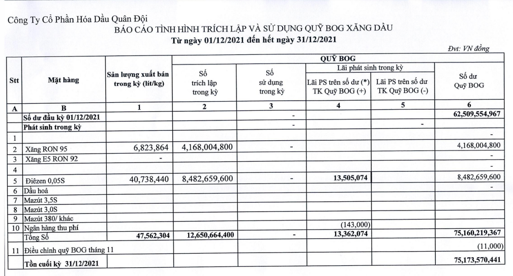 Báo cáo tình hình trích lập và sử dụng quỹ bình ổn giá xăng dầu của Công ty Cổ phần Hóa dầu Quân đội: