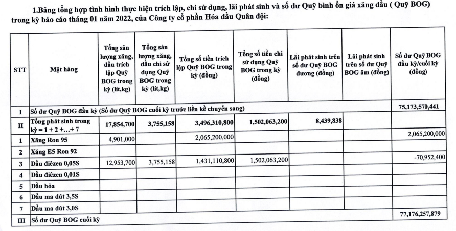 Báo cáo tình hình trích lập và sử dụng quỹ bình ổn giá xăng dầu của Công ty Cổ phần Hóa dầu Quân đội: