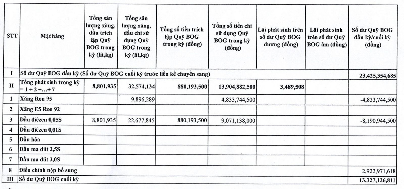 Báo cáo tình hình trích lập và sử dụng quỹ bình ổn giá xăng dầu của Công ty Cổ phần Hóa dầu Quân đội: