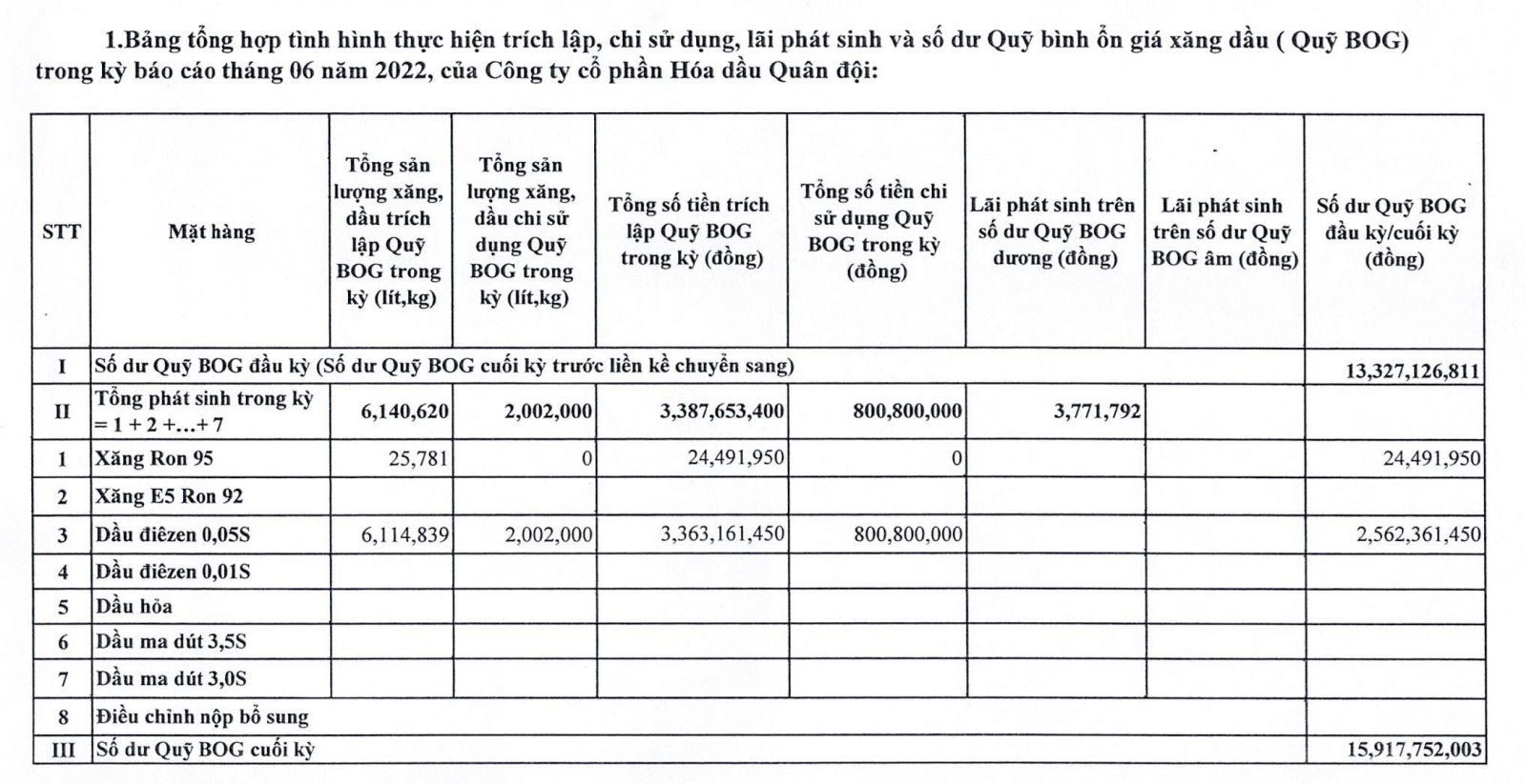 Báo cáo tình hình trích lập và sử dụng quỹ bình ổn giá xăng dầu của Công ty Cổ phần Hóa dầu Quân đội: