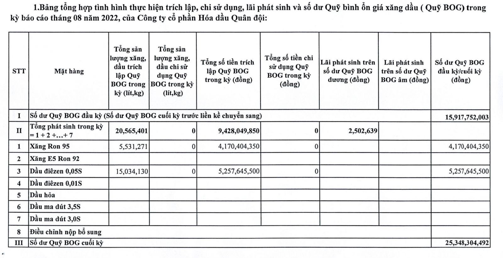 Báo cáo tình hình trích lập và sử dụng quỹ bình ổn giá xăng dầu của Công ty Cổ phần Hóa dầu Quân đội: