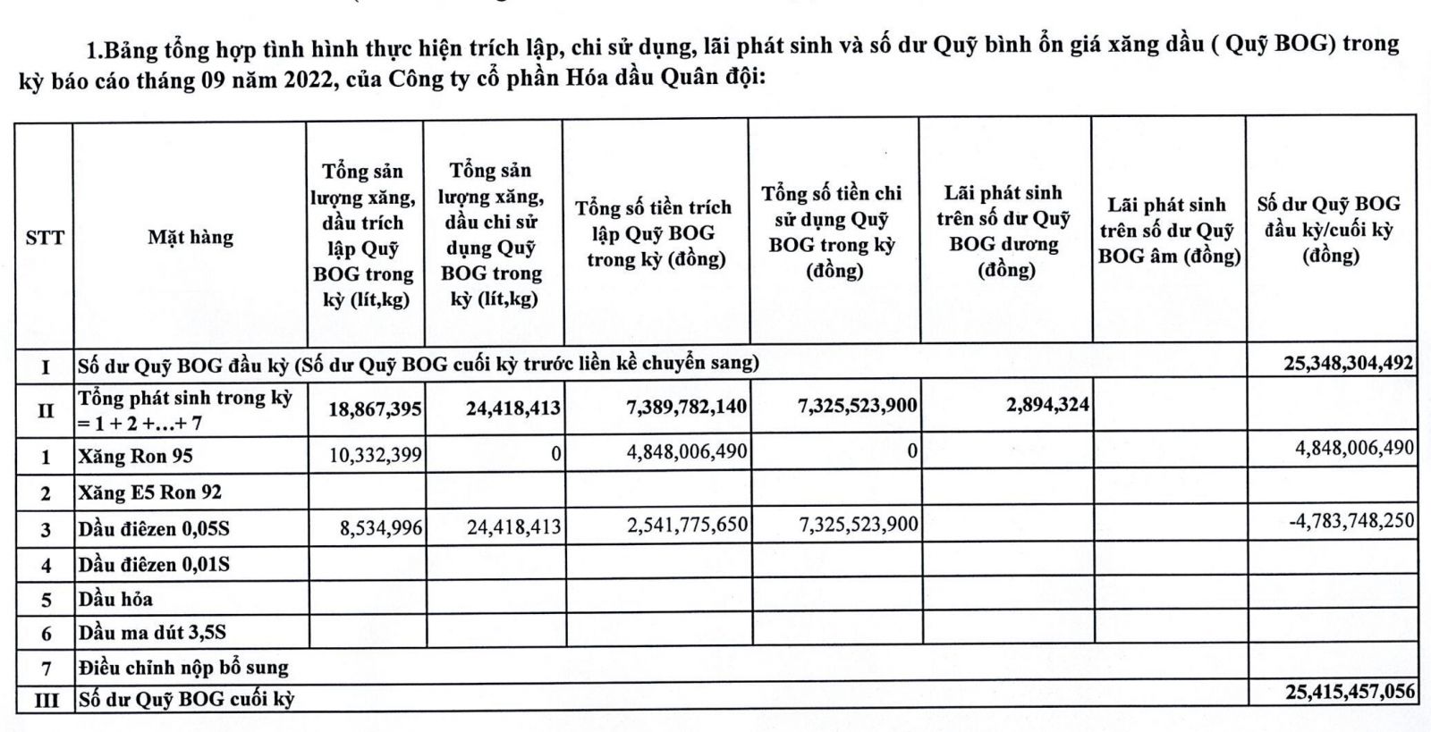 Báo cáo tình hình trích lập và sử dụng quỹ bình ổn giá xăng dầu của Công ty Cổ phần Hóa dầu Quân đội: