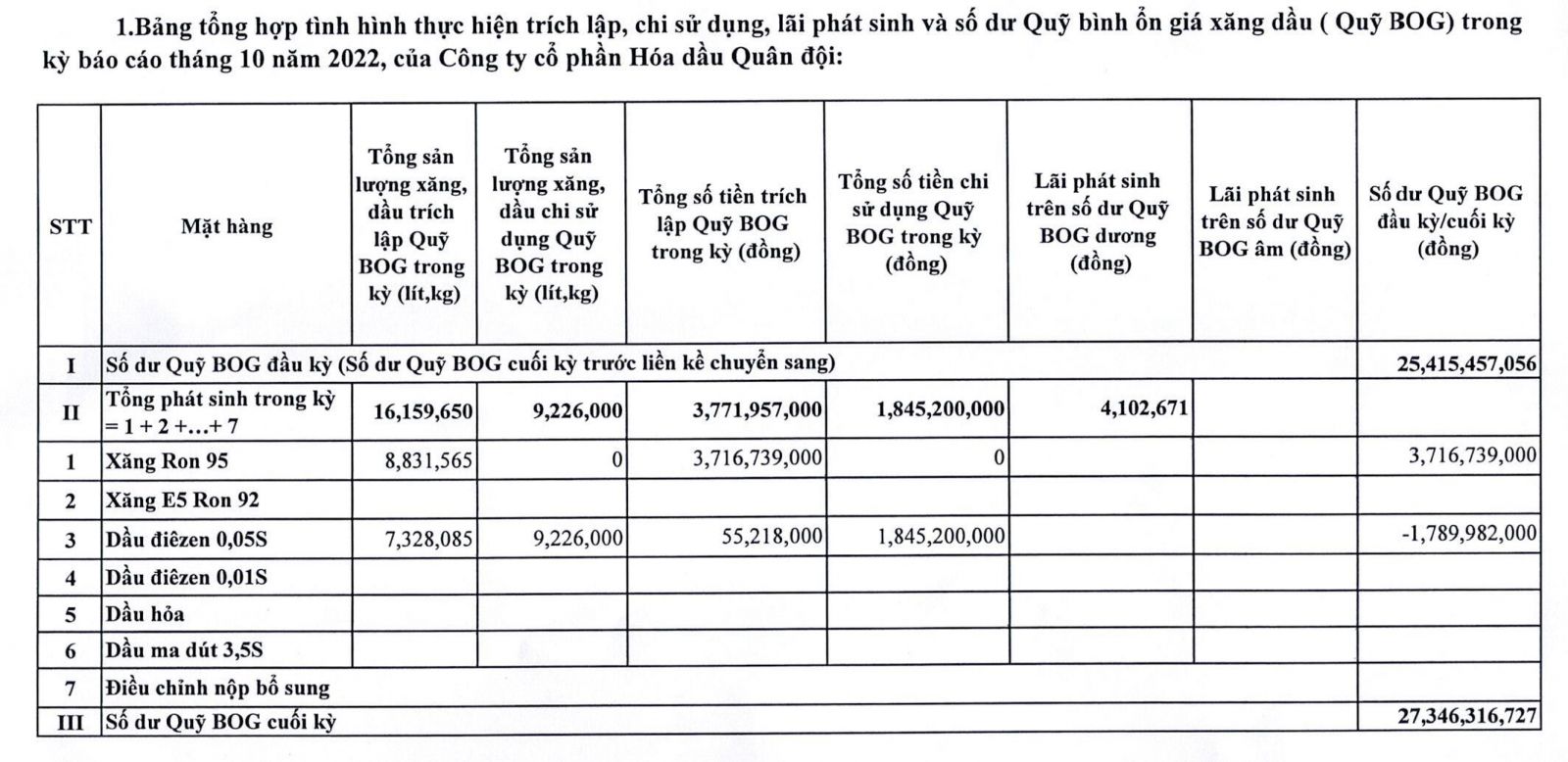 Báo cáo tình hình trích lập và sử dụng quỹ bình ổn giá xăng dầu của Công ty Cổ phần Hóa dầu Quân đội: