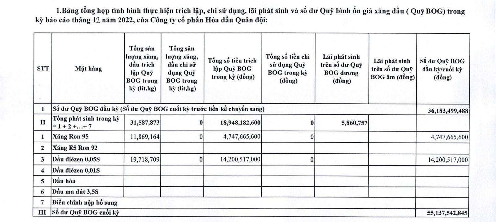 Báo cáo tình hình trích lập và sử dụng quỹ bình ổn giá xăng dầu của Công ty Cổ phần Hóa dầu Quân đội: