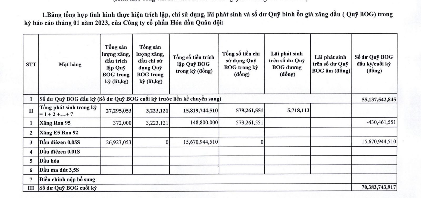 Báo cáo tình hình trích lập và sử dụng quỹ bình ổn giá xăng dầu của Công ty Cổ phần Hóa dầu Quân đội: