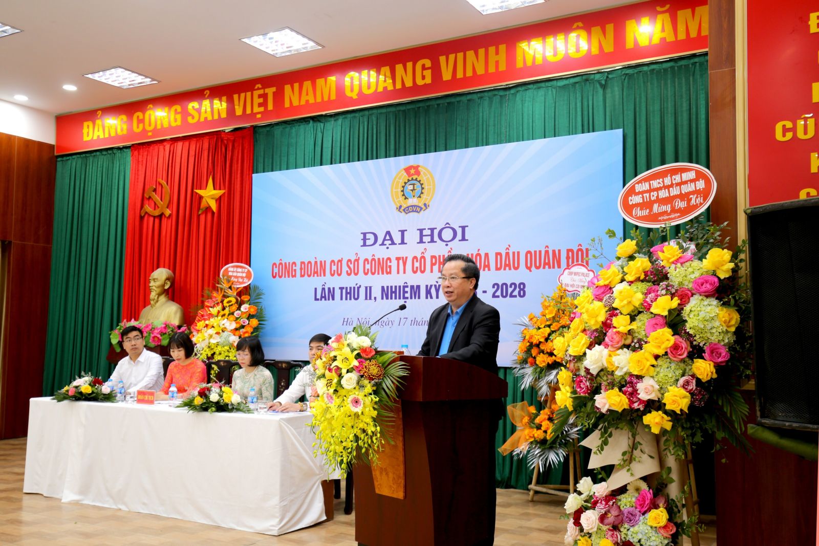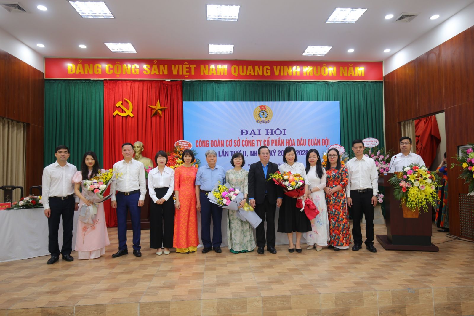 Đ/c Quách Văn Ngọc - Phó Chủ tịch Công đoàn Công thương Việt Nam; Đ/c Nguyễn Gia Lễ- Phó TGĐ MIPEC và Đ/c Phạm Mạnh Cường- Bí thư Đảng ủy MIPEC tặng hoa chúc mừng BCH Công đoàn MIPEC nhiệm kỳ mới