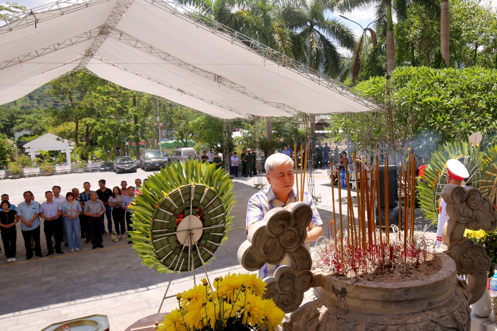 Sau lễ viếng, dâng hoa, dâng hương tưởng niệm các Anh hùng Liệt sỹ tại Nghĩa trang Liệt sỹ Quốc gia Vị Xuyên, Đoàn công tác đã đến dâng hương tại đền thờ các Anh hùng liệt sỹ trên điểm cao 468.