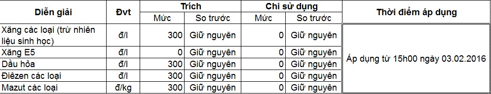 Theo văn bản số 1273/BCT-TTTN của Bộ Công thương về việc điều hành kinh doanh xăng dầu, mức trích chi sử dụng Quỹ bình ổn giá xăng dầu (BOG) từ 15 giờ 00 ngày 03.02.2016 không thay đổi so với văn bản số 564/BCT-TTTN ngày 19.01.2016 của Bộ Công thương về điều hành kinh doanh xăng dầu.