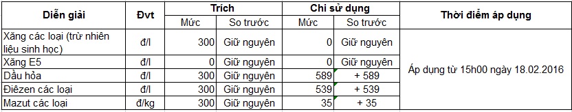 Mức giá mới có hiệu lực từ thời điểm 15 giờ 00 ngày 18 tháng 02 năm 2016 cho đến khi có thông cáo báo chí (TCBC) mới.