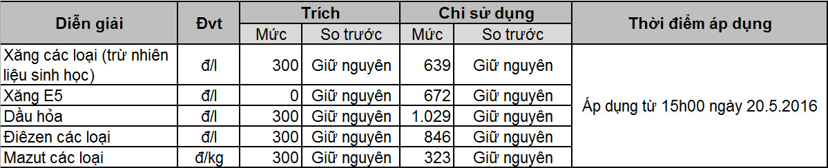 Theo văn bản số 4353/BCT-TTTN của Bộ Công Thương về việc điều hành kinh doanh xăng dầu, mức trích lập và chi sử dụng Quỹ bình ổn giá xăng dầu (BOG) từ 15 giờ 00 ngày 20.5.2016, cụ thể như sau: