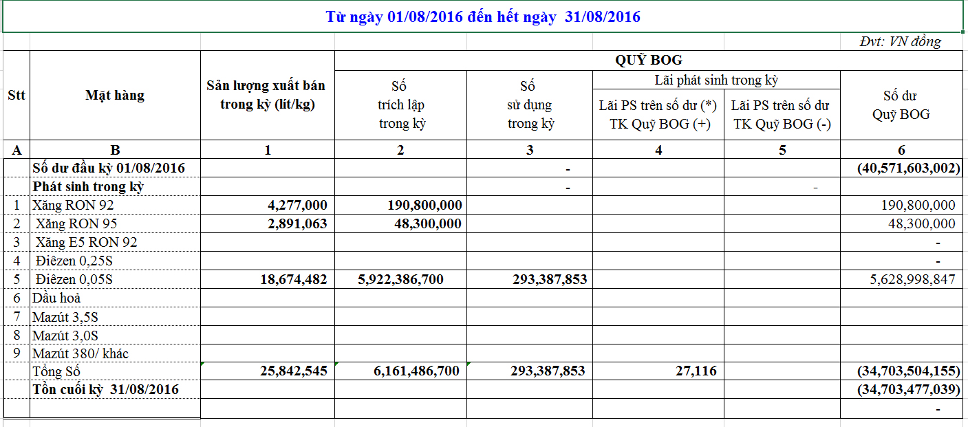 Theo văn bản số 9434/BCT-TTTN của Bộ Công Thương về việc điều hành kinh doanh xăng dầu, mức trích lập và chi sử dụng Quỹ bình ổn giá xăng dầu (BOG) từ 16 giờ 30 ngày 05/10/2016, cụ thể như sau: