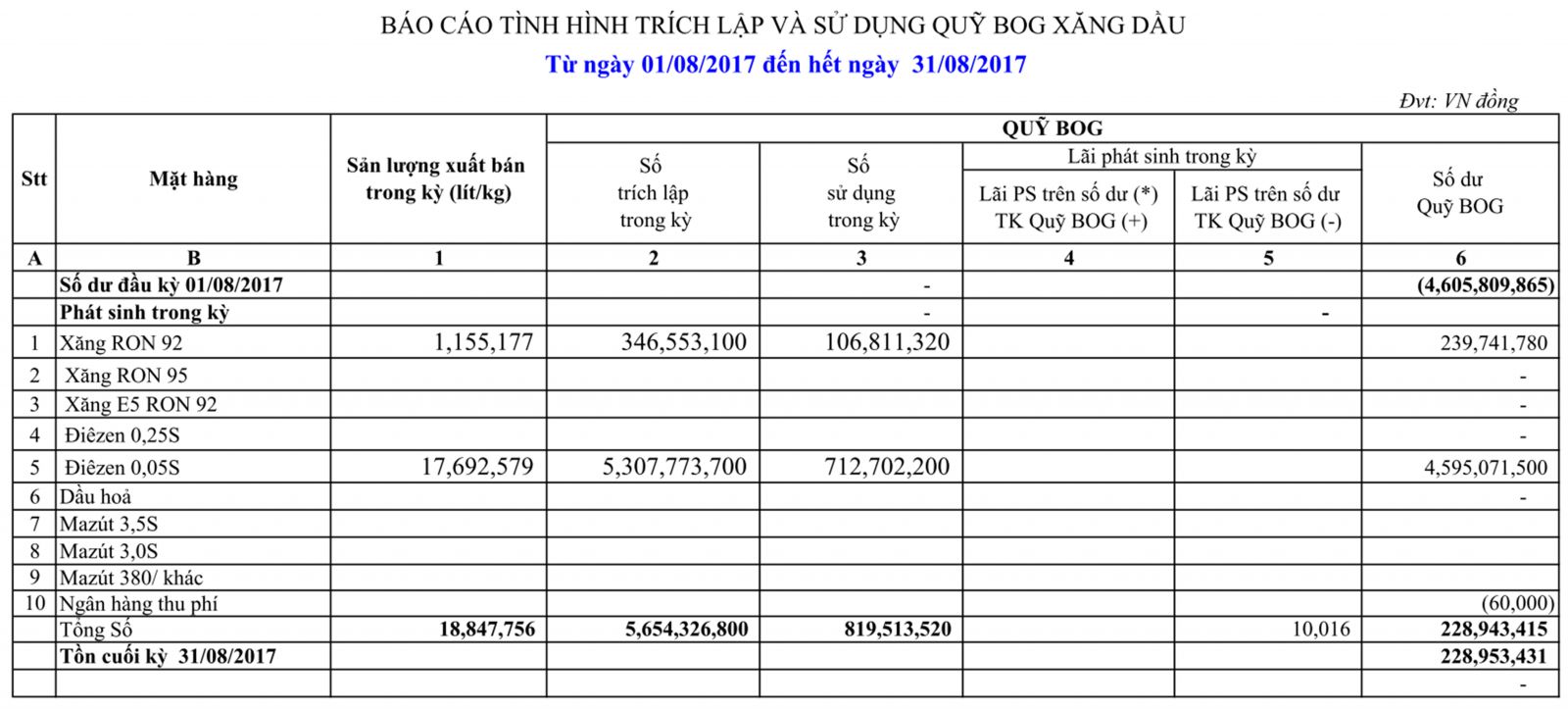Báo cáo tình hình trích lập và sử dụng quỹ bình ổn giá xăng dầu của Công ty Cổ phần Hóa dầu Quân đội: