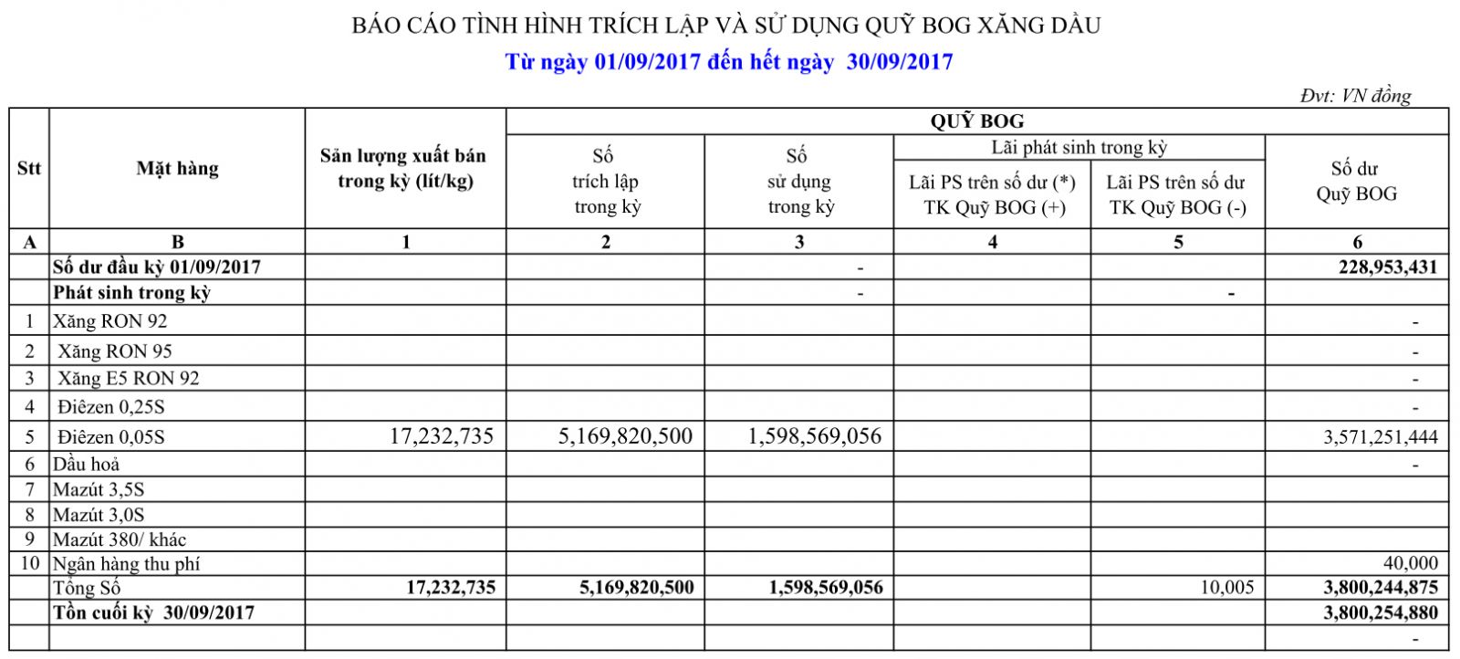 Báo cáo tình hình trích lập và sử dụng quỹ bình ổn giá xăng dầu của Công ty Cổ phần Hóa dầu Quân đội: