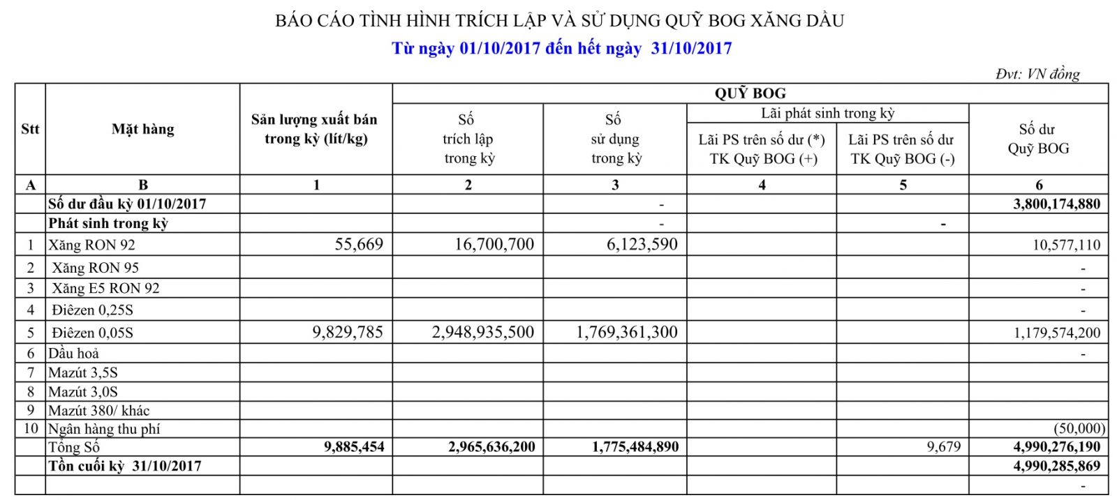 Báo cáo tình hình trích lập và sử dụng quỹ bình ổn giá xăng dầu của Công ty Cổ phần Hóa dầu Quân đội: