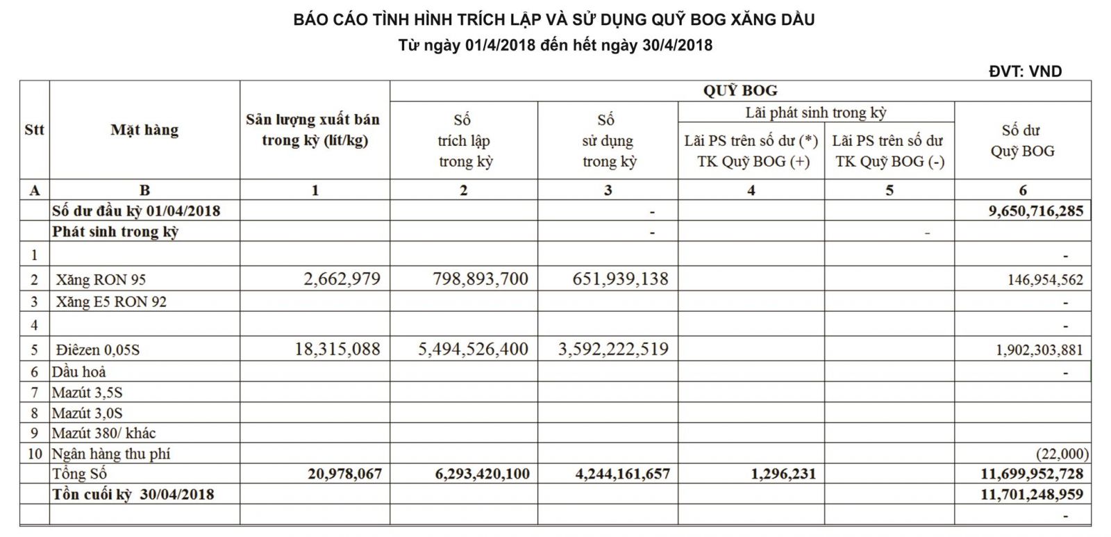 Theo văn bản số 4968/BCT-TTTN của Bộ Công Thương về việc điều hành kinh doanh xăng dầu, mức trích lập và chi sử dụng Quỹ bình ổn giá xăng dầu (BOG) từ 15 giờ 00 ngày 22/6/2018, cụ thể như sau: