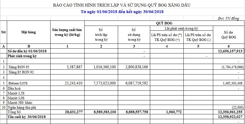 Báo cáo tình hình trích lập và sử dụng quỹ bình ổn giá xăng dầu của Công ty Cổ phần Hóa dầu Quân đội: