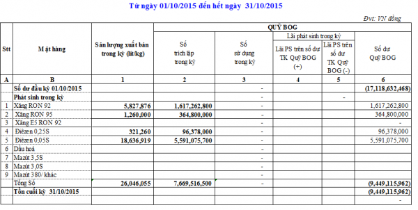 Báo cáo tình hình trích lập và sử dụng quỹ bình ổn giá xăng dầu của Công ty Cổ phần Hóa dầu Quân đội: