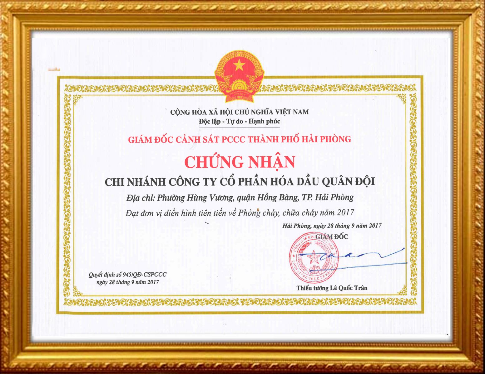 Sáng 6/10/2017, Cảnh sát Phòng cháy chữa cháy (PCCC) TP. Hải Phòng đã tổ chức Hội nghị biểu dương điển hình tiên tiến về PCCC năm 2017. Công ty Cổ phần Hóa dầu Quân Đội (MIPEC) - Chi nhánh Hải Phòng đã vinh dự nhận chứng nhận Đơn vị điển hình tiên tiến về PCCC năm 2017 do Giám đốc Cảnh sát PCCC TP. Hải Phòng trao tặng.