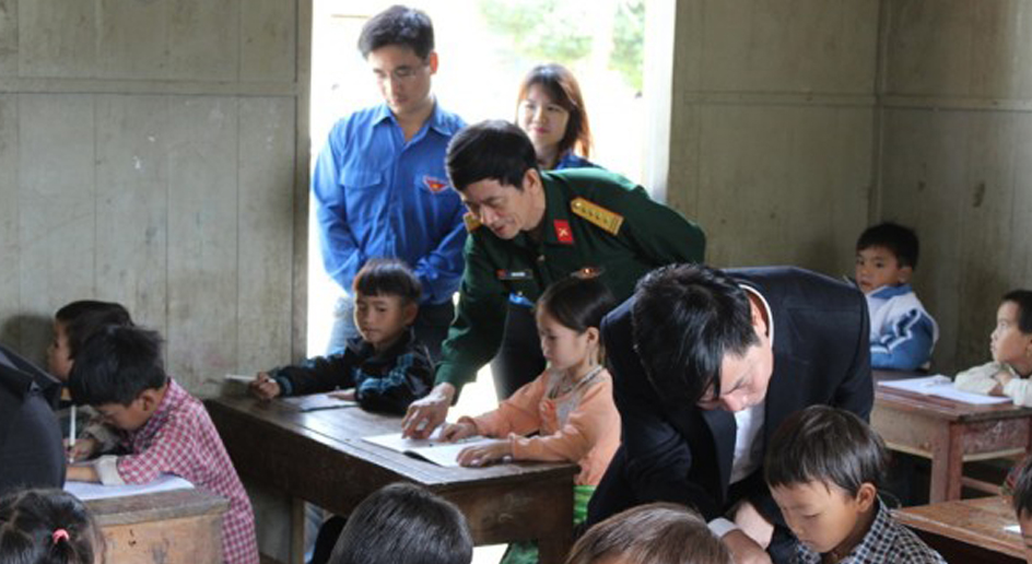 Nụ cười rạng ngời của các tình nguyện viên bên cạnh các em học sinh
