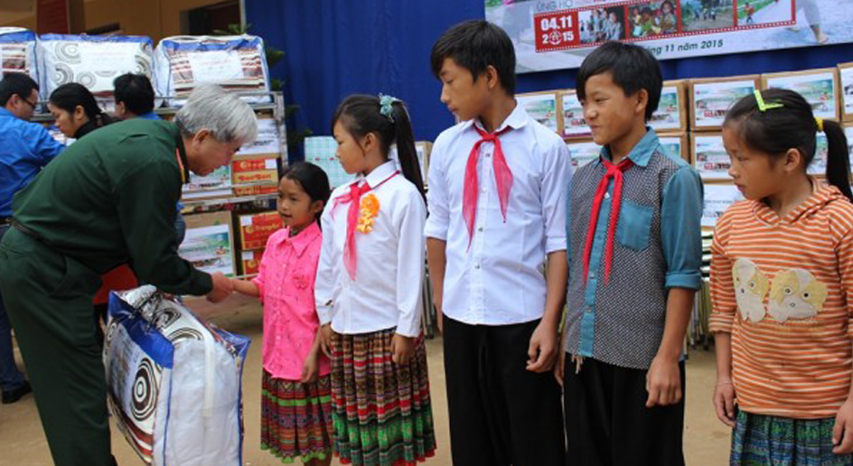 Đồng chí Dư Cao Sơn – đại diện Mipec tặng quà các em học sinh tại trường Phổ thông Dân tộc Bán trú, xã Xà Hồ, huyện Trạm Tấu, Yên Bái