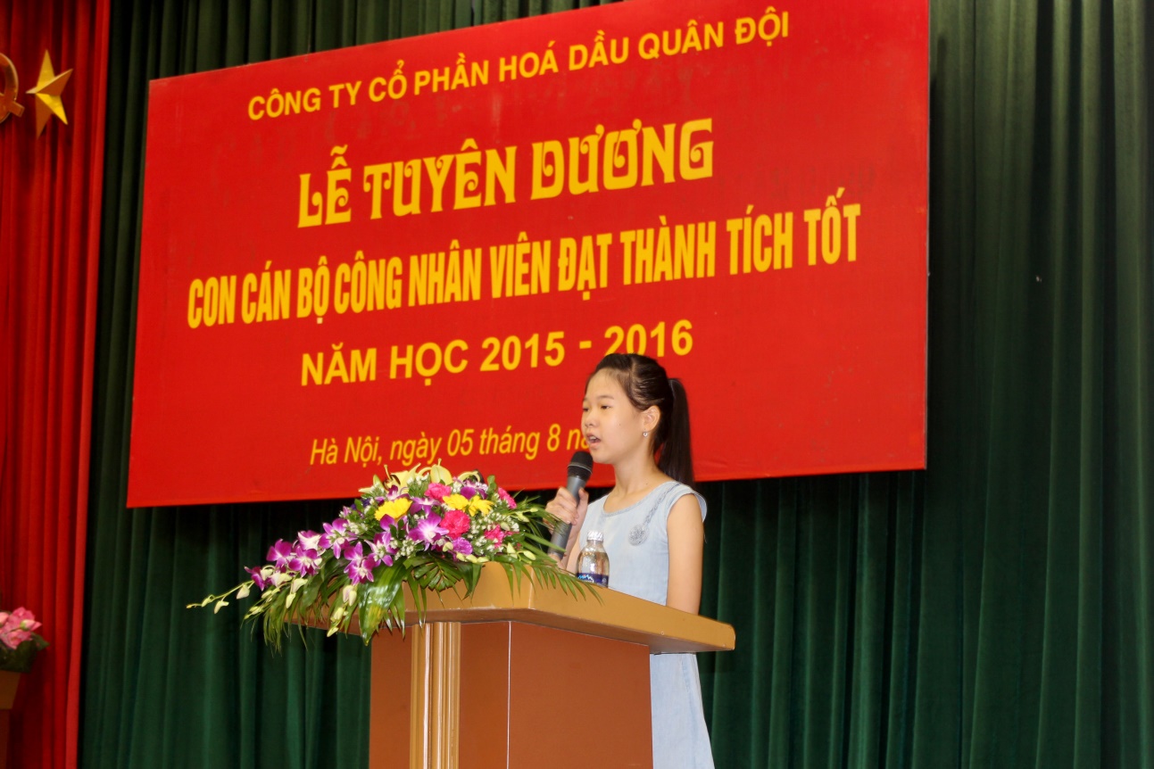 Lễ tuyên dương, khen thưởng các cháu học sinh đạt thành tích cao trong học tập là một hoạt động thường niên có ý nghĩa thiết thực nhằm khích lệ con CBCNV trong Công ty Cổ phần Hóa dầu Quân đội giữ vững và phát huy hơn nữa thành tích đã đạt được trong học tập, động viên các con phấn đấu rèn luyện đạo đức, tu dưỡng nhân cách để trở thành con ngoan trò giỏi, là niềm tự hào, là nguồn động viên to lớn giúp bố mẹ yên tâm công tác.