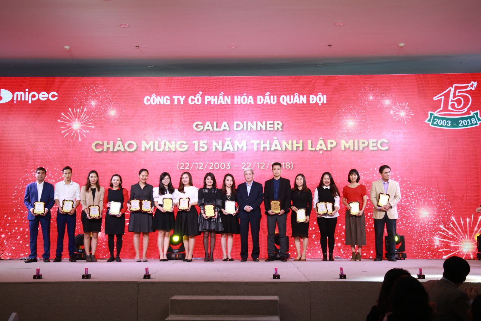 Ngày 21/12, chương trình Gala Dinner “Chào mừng 15 năm thành lập MIPEC” đã diễn ra trong không khí tưng bừng, trang trọng tại Trung tâm tiệc cưới và Hội nghị Mipec Palace với sự tham gia của nhiều vị khách quý và toàn thể CBNV MIPEC. Chương trình được tổ chức nhân kỷ niệm 74 năm ngày thành lập Quân đội nhân dân Việt Nam (22/12/1944-22/12/2018) và 15 năm ngày thành lập MIPEC (22/12/2003-22/12/2018).