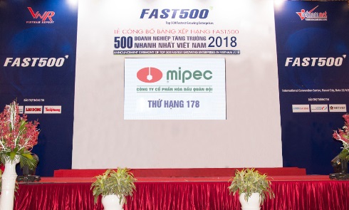 Công ty CP Báo cáo Đánh giá Việt Nam - Vietnam Report kết hợp cùng Báo Vietnamnet vừa chính thức công bố Bảng xếp hạng FAST500 - Top 500 doanh nghiệp tăng trưởng nhanh nhất Việt Nam năm 2018. Công ty Cổ phần Hóa dầu Quân Đội (MIPEC) vinh dự có mặt trong bảng xếp hạng uy tín này với vị trí 178, tăng 218 bậc so với năm 2017. Đây là năm thứ 6 MIPEC lọt Top 500 doanh nghiệp tăng trưởng nhanh nhất Việt Nam.